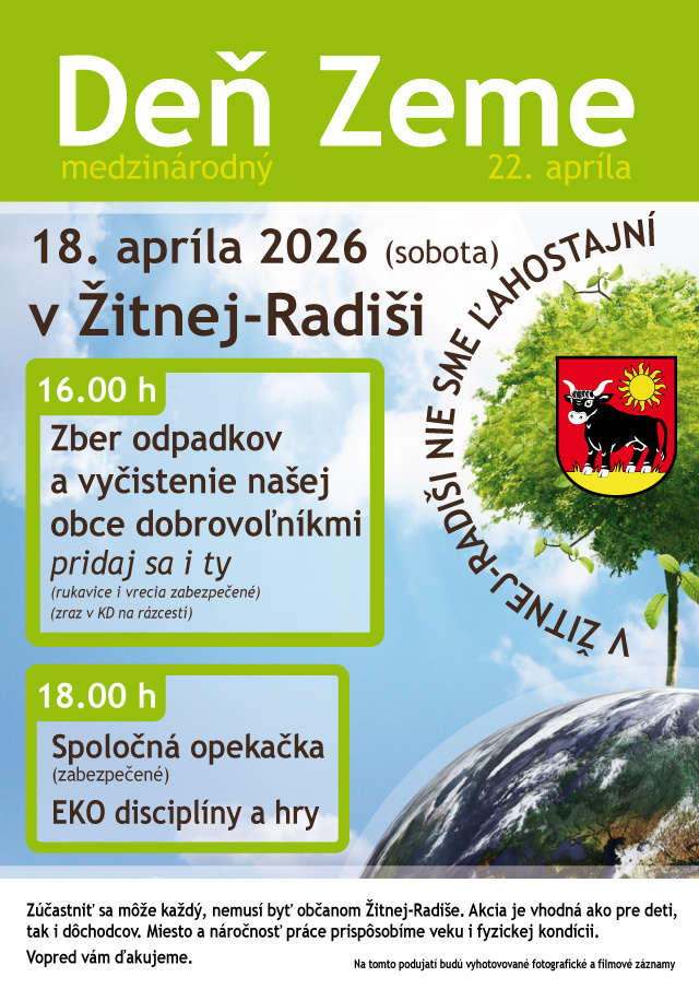 Slnečná sobota 18. apríla 2026 v obci Žitná-Radiša opäť patrila tradičnej akcii – Dňu Zeme. Ako každý rok, aj tentoraz sa do nej zapojili obyvatelia všetkých vekových kategórií. Po rozdelení do skupín vyčistili od odpadkov nielen samotnú obec, ale aj jej okolie. Kým priamo v obci sa odpadu nachádzalo len minimum, na poľných cestách ho bolo podstatne viac. Pozitívnou správou je, že išlo prevažne o starší odpad, ktorý sa tam nachádzal už dlhšie, pričom nové čierne skládky v obci našťastie nevznikajú. Po zbere odpadkov bola na ihrisku pripravená spoločná opekačka. Zúčastnení si pochutili na párkoch, špekáčikoch, káve s koláčikom a deti sa tešili najmä z opekaných marshmallow. Aj tento rok si mohli malí i veľkí zastrieľať z luku. Príjemná atmosféra na ihrisku pretrvávala až do zotmenia. Aj takáto spoločná aktivita ukazuje, aký význam má starostlivosť o naše okolie. Mali by sme preto všetci myslieť na ochranu prírody a správať sa k nej zodpovedne počas celého roka. text: Michaela Bašková, foto: XY