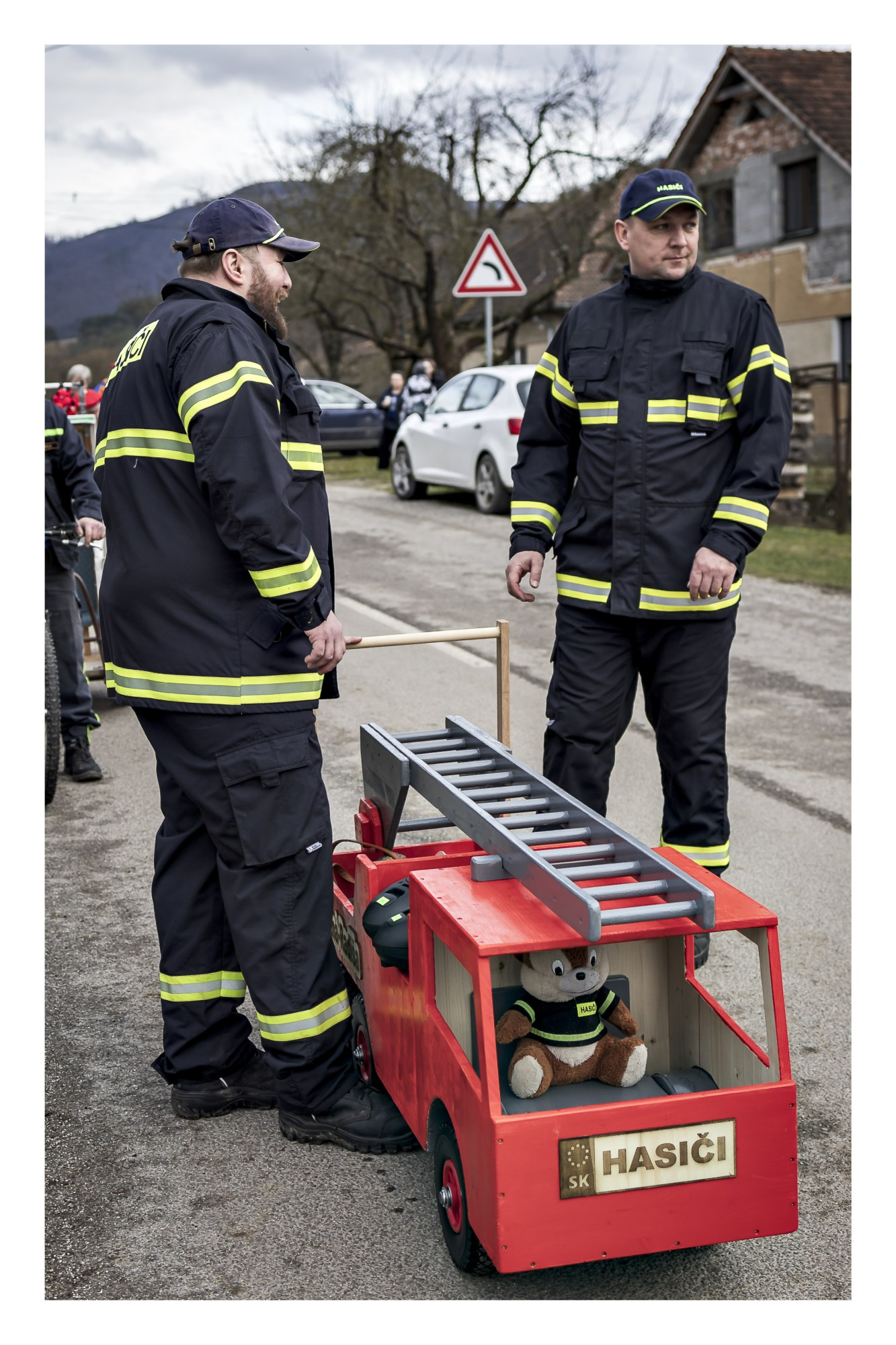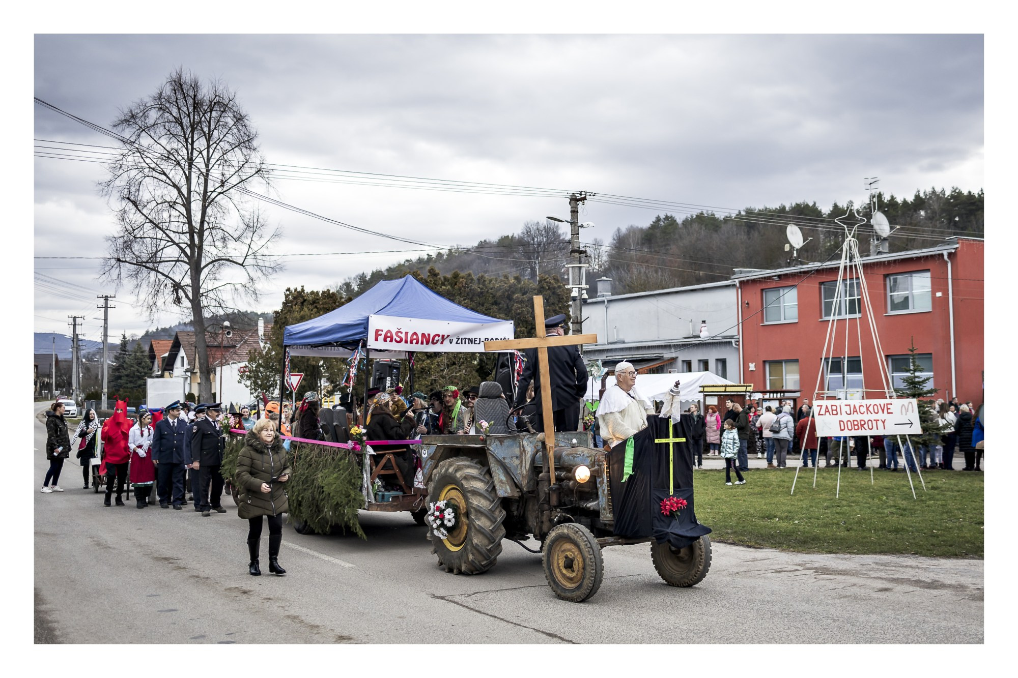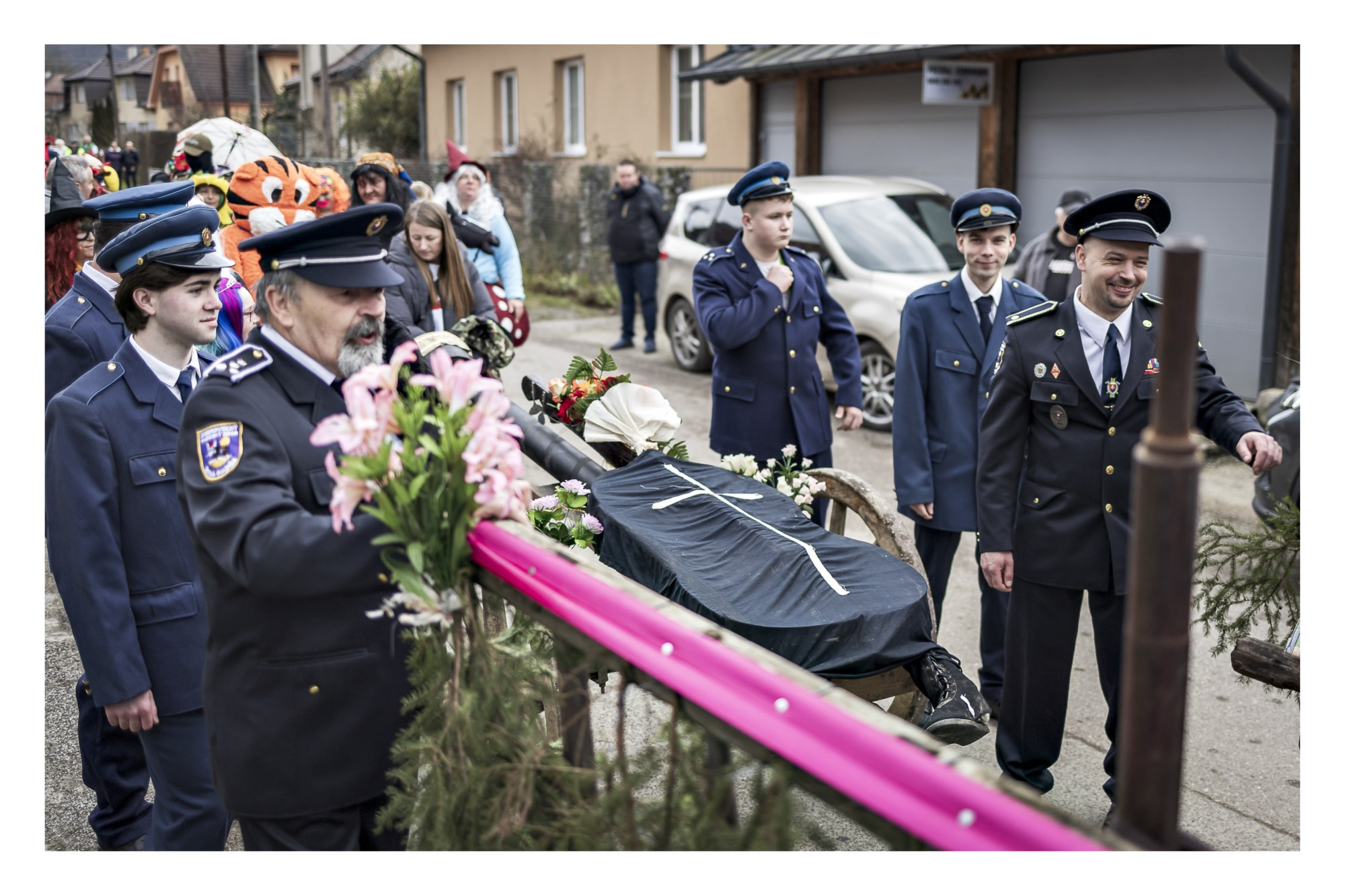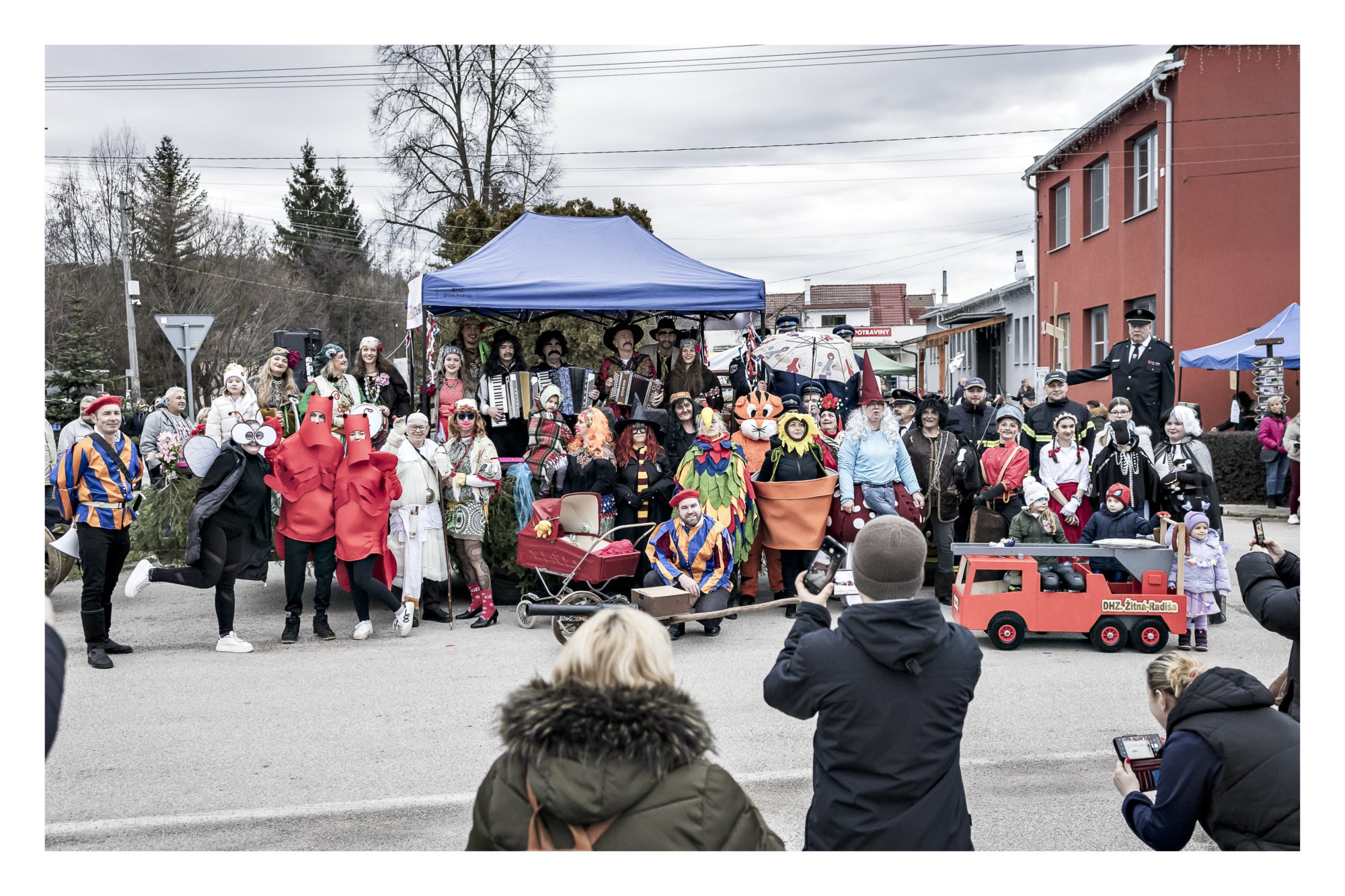 Za hudobnou vlečkou bol pripevnený ďalší unikát – dvojkolesové delo, na ktorom bola symbolicky uložená „nebožtíčka“ basa. Sprievod, v ktorom bolo možné napočítať viac ako 50 rozmanitých a doma vyrobených masiek, sprevádzali hasiči v slávnostných uniformách. Obyvatelia obce opäť ukázali svoje veľké srdce a pohostinnosť. Pri svojich bránach hostili masky tradičnými dobrotami a mnohí sa k veselému davu rovno pripojili. Osvieženie v sprievode zabezpečovali aj hasiči zo svojho nového minihasičského auta, ktoré namiesto vody rozlievalo dobrú náladu.