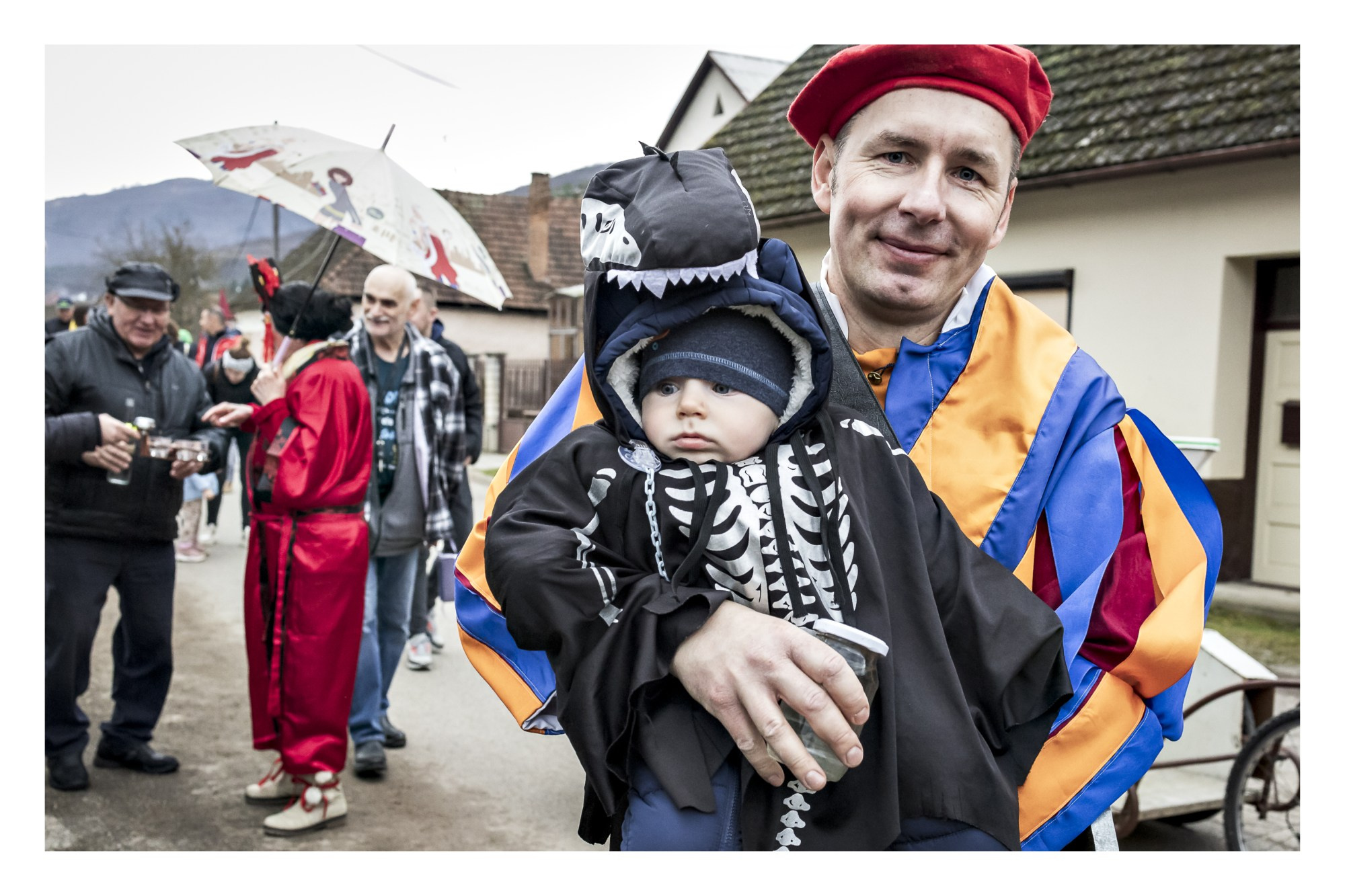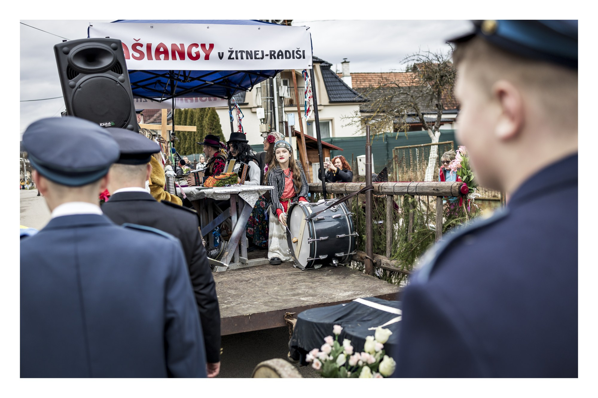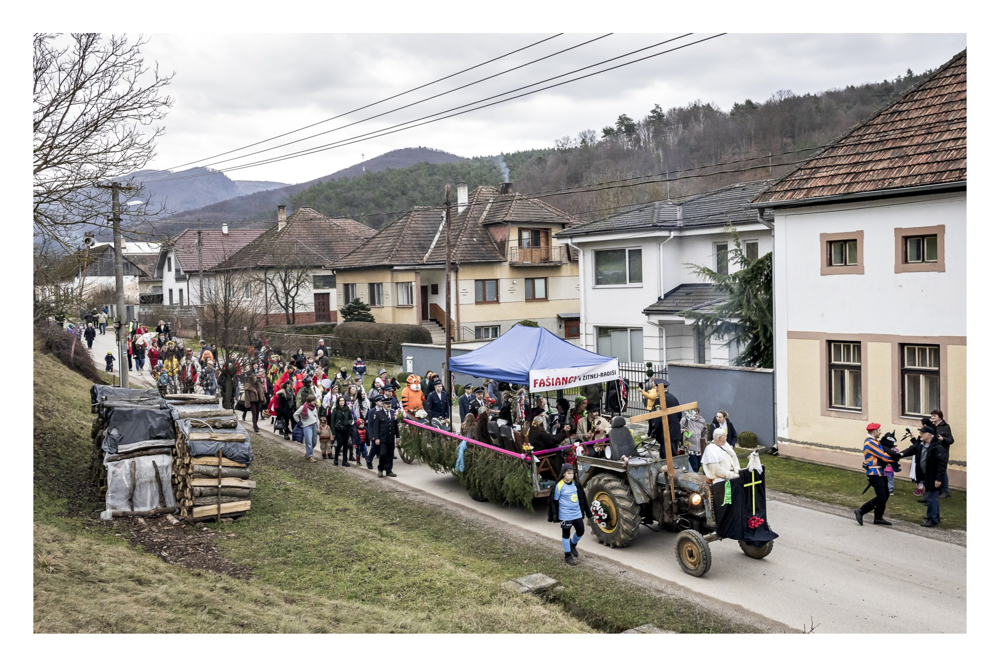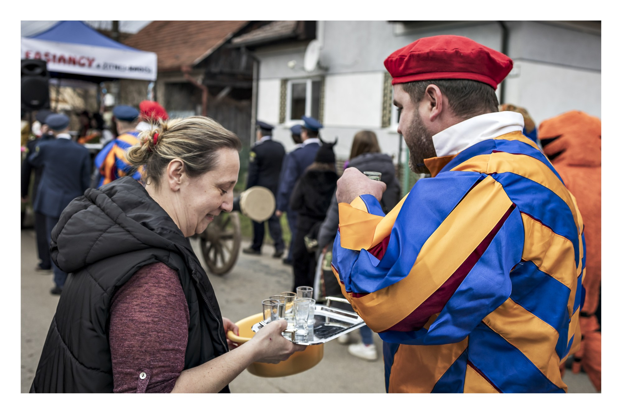 Za hudobnou vlečkou bol pripevnený ďalší unikát – dvojkolesové delo, na ktorom bola symbolicky uložená „nebožtíčka“ basa. Sprievod, v ktorom bolo možné napočítať viac ako 50 rozmanitých a doma vyrobených masiek, sprevádzali hasiči v slávnostných uniformách. Obyvatelia obce opäť ukázali svoje veľké srdce a pohostinnosť. Pri svojich bránach hostili masky tradičnými dobrotami a mnohí sa k veselému davu rovno pripojili. Osvieženie v sprievode zabezpečovali aj hasiči zo svojho nového minihasičského auta, ktoré namiesto vody rozlievalo dobrú náladu.