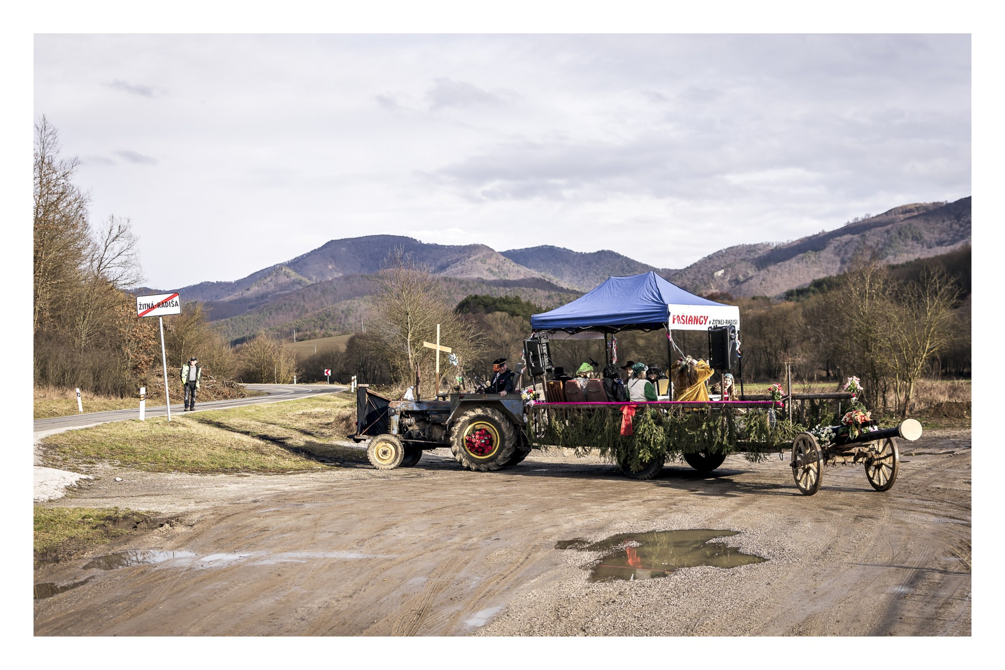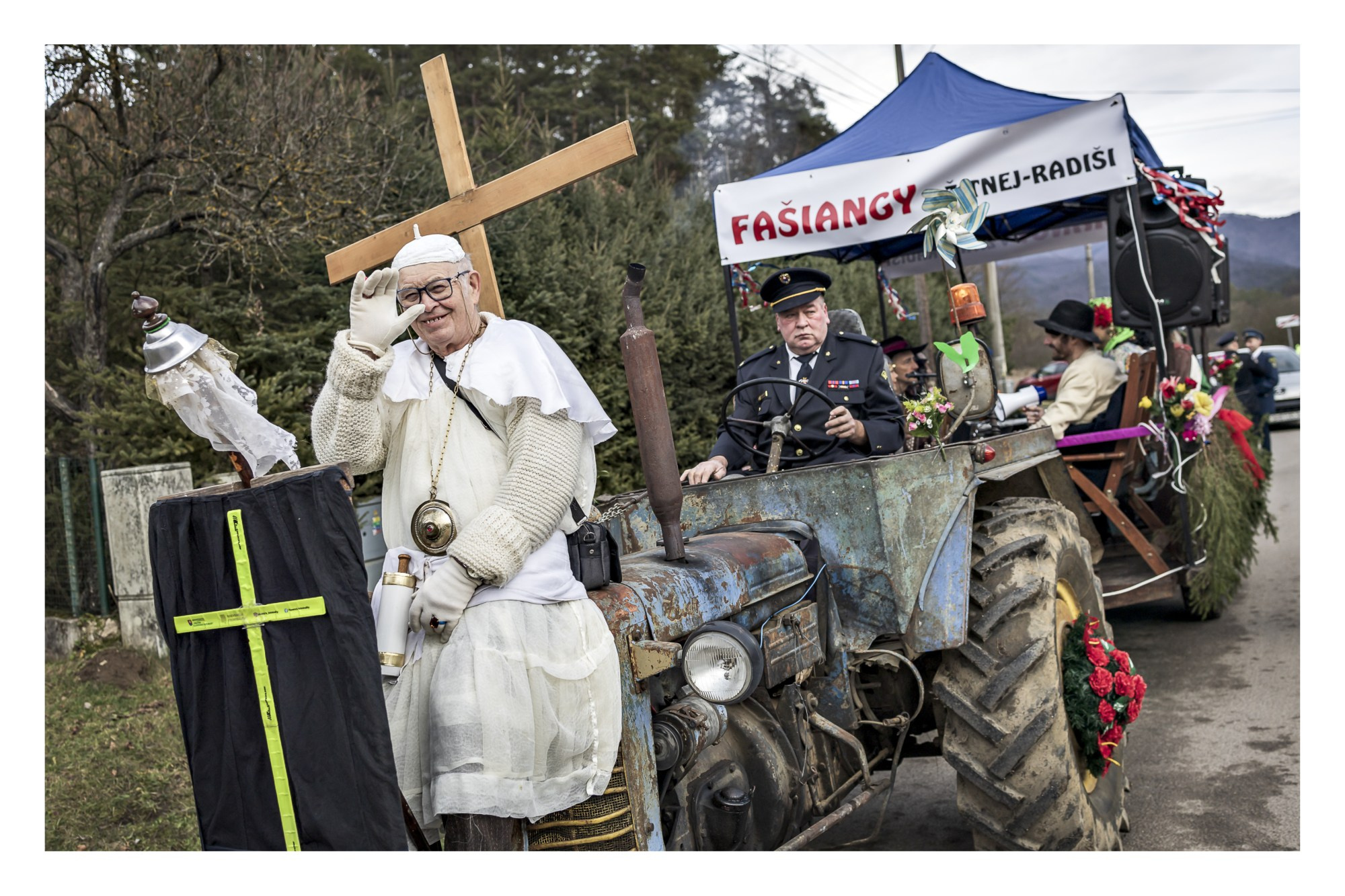 Program odštartoval o 15.00 hodine maškarným sprievodom. Tento rok bol však výnimočný vďaka novovytvorenému fašiangovému konvoju. Na čele bol traktor, ktorý mal na prednej časti čestné miesto pre netradičného pasažiera – „Pápeža“. Traktor za sebou ťahal špeciálne upravenú vlečku, ktorá slúžila ako pojazdné pódium pre členov folklórnej skupiny Rozmajrín. Tí sa počas celej trasy starali o rezký hudobný sprievod a spev.