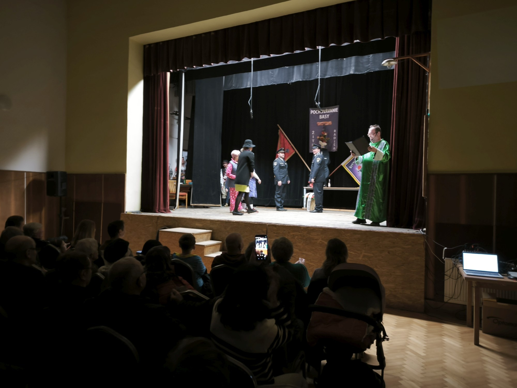 Sprievod vyvrcholil na rázcestí pri obecnom úrade, kde už na účastníkov čakali voňavé zabíjačkové špeciality a pre masky zaslúžená horúca kapustnica. Po spoločnom fotení masiek sa dianie presunulo do interiéru, kde od 18.00 hodiny prebiehal hlavný program pochovávania basy. Hasiči si pripravili pásmo plné humoru a nových prvkov, v ktorom divákov najskôr pobavili tanečné vystúpenia dám zo Zväzu žien, ZO SZZP a Jednoty dôchodcov Slovenska.