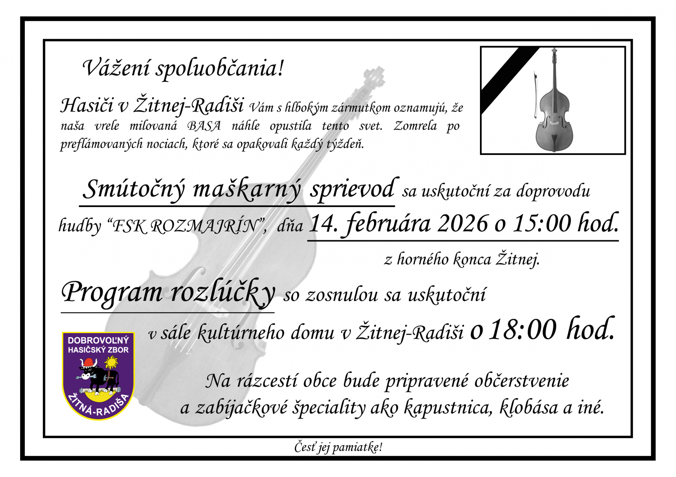 Sobota 14. februára 2026 sa v obci Žitná-Radiša niesla v znamení tradícií, smiechu a dobrej nálady. Miestni dobrovoľní hasiči v spolupráci s obcou a miestnymi organizáciami pripravili nezabudnuteľné „Pochovávanie basy“, ktoré prilákalo nielen domácich, ale aj množstvo zvedavcov z okolia.