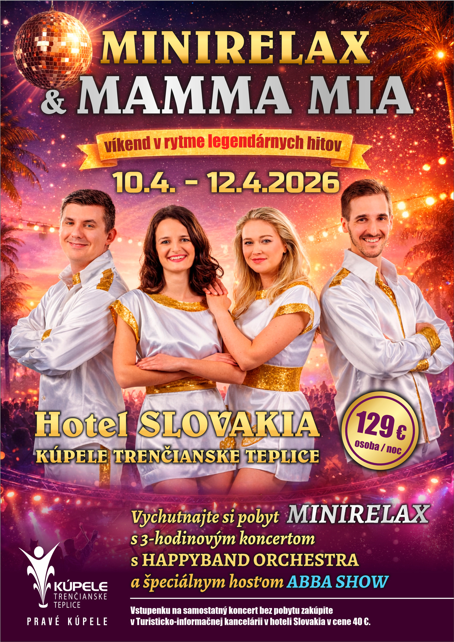 Vychutnajte si jedinečný pobyt MINIRELAX, ktorého vyvrcholením bude exkluzívny 3-hodinový koncert. Tešiť sa môžete na skvelý HAPPYBAND ORCHESTRA a špeciálneho hosťa večera – strhujúcu ABBA SHOW.
