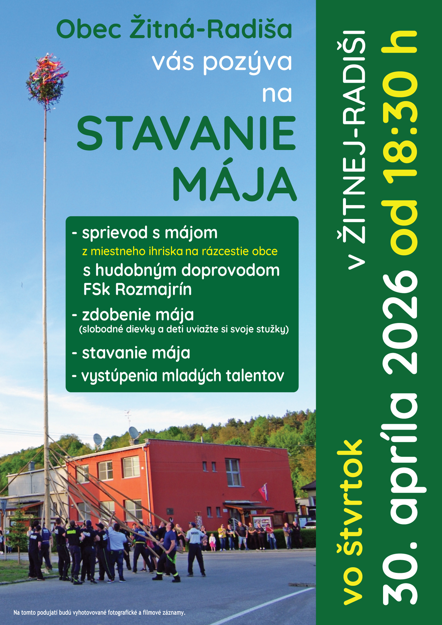 Vo štvrtok 30. apríla 2026 od 18:30 h sa uskutoční v Žitnej-Radiši tradičné stavanie mája.