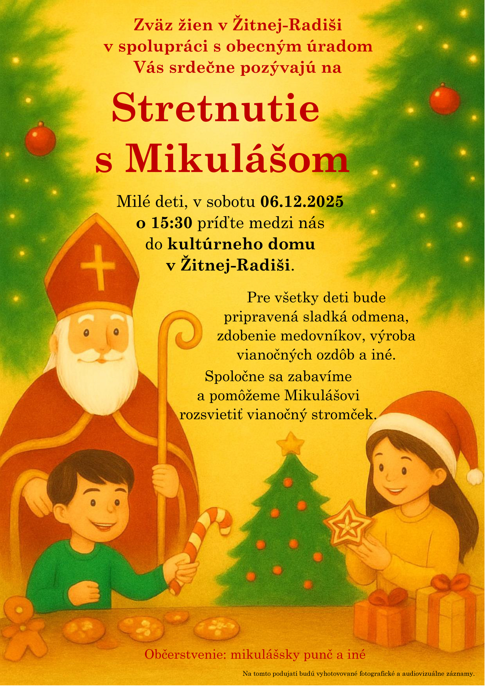 Milé deti, v sobotu 06.12.2025 o 15:30 príďte medzi nás do kultúrneho domu v Žitnej-Radiši.
