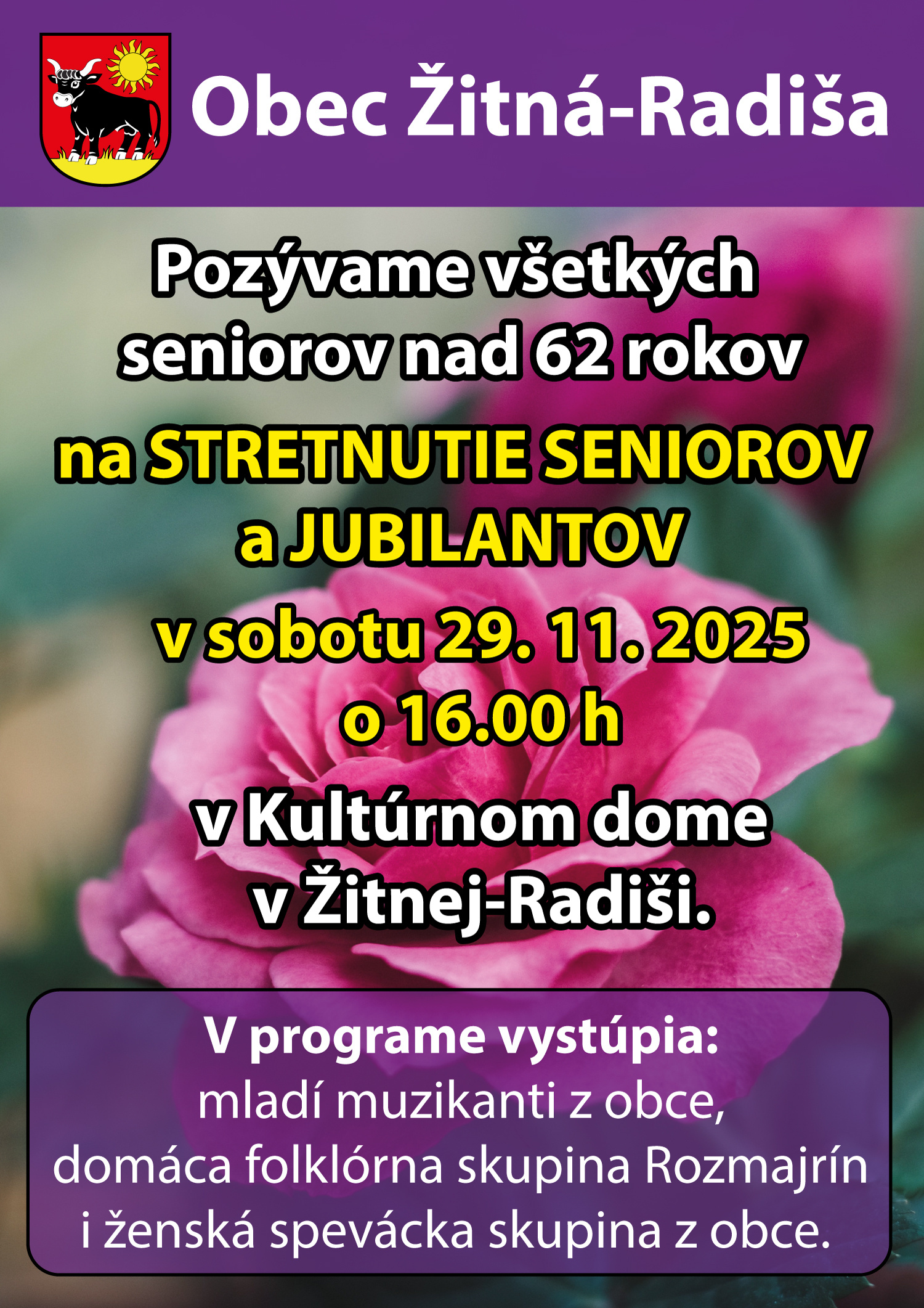 Pozývame všetkých seniorov nad 62 rokov na STRETNUTIE SENIOROV a JUBILANTOV, v sobotu 29.11.2025 o 16.00 h v Kultúrnom dome v Žitnej-Radiši.